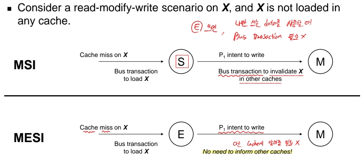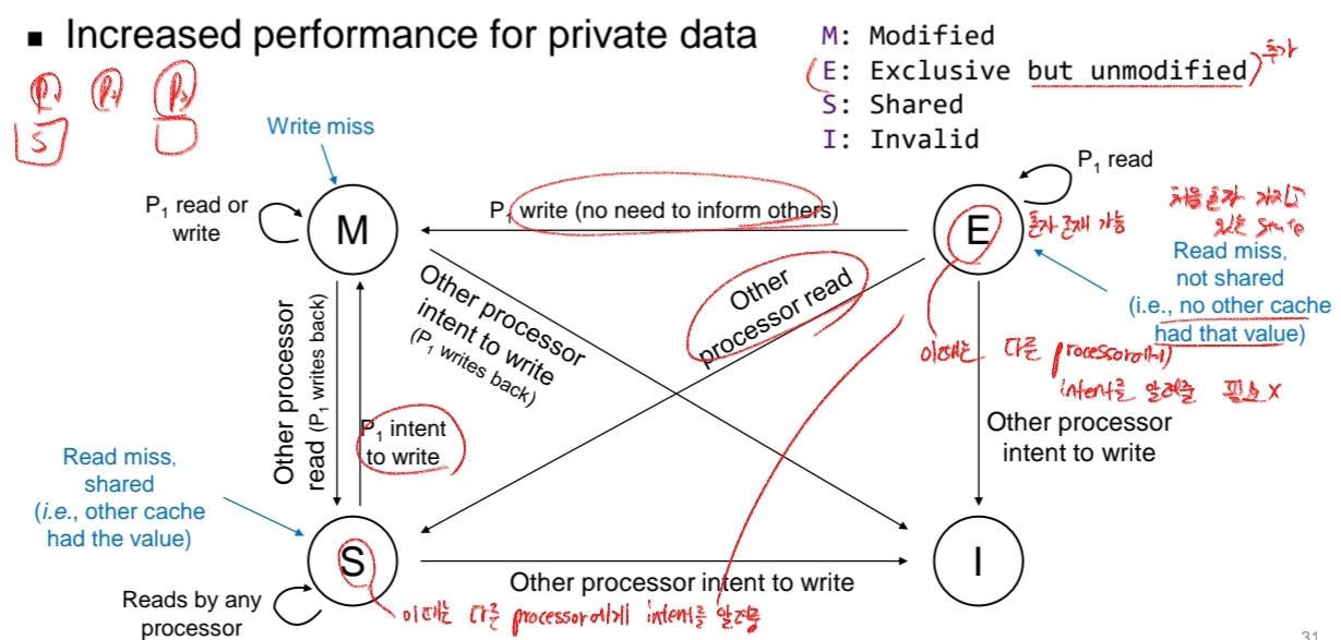 즉, Read miss가 나서 처음 혼자 가지고 있는 상태일 때, E state를 가집니다. 이 때는 다른 processor에 write할 intent없이 혼자 modified로 갈 수 있습니다. MSI의 큰 단점은, 나만 쓰는 data를 사용할 때, 항상 write intent를 bus transaction을 통해 다른 cache에 알려주고 invalidate를 해야한다는 점이었습니다. E를 추가하면, 자기 혼자만 가지고 있는 data는 다른 cache에 write intent를 할 필요 없이 write할 수 있게 됩니다. 즉, 훨씬 더 빠르다는 것이지요.