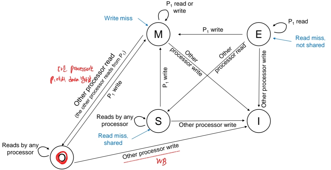 이와 같이 O state를 추가하여, S state인 cache들은 memory update할 필요없이 꼭 필요한 memory update만 할 수 있게 되죠.