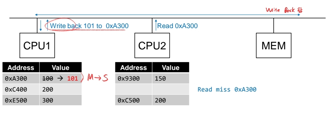 이 때 CPU2가 0xA300을 read하고 싶어합니다. 하지만 "Invalidate"상태로 인해 해당 cache line이 miss가 되죠. 그러면 마찬가지로 CPU2에서는 0xA300을 read하고 싶다는 signal을 보냅니다.