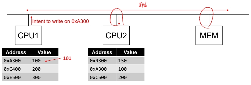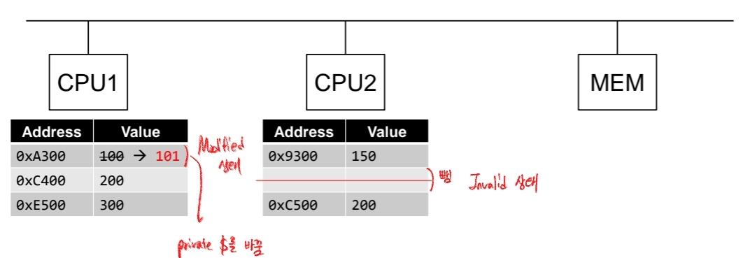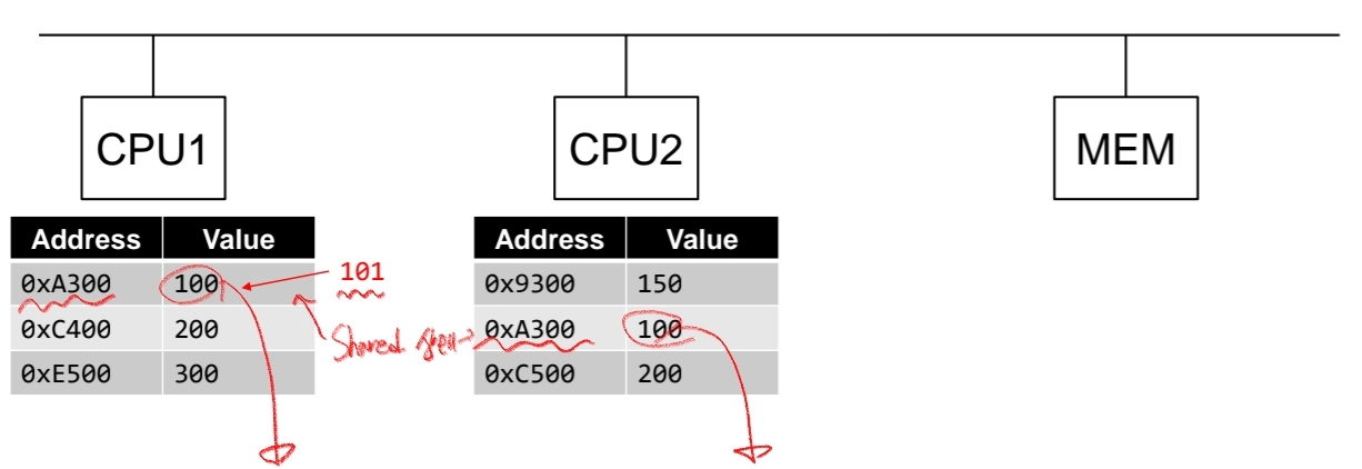 위와 같이 0xA300이라는 주소에 100이라는 value를 CPU1 cache와 CPU2 cache가 서로 가지고 있습니다. 즉, shared된 상태이죠. 하지만 이 때 CPU1에서 0xA300이라는 주소에 101을 write하고 싶어합니다.